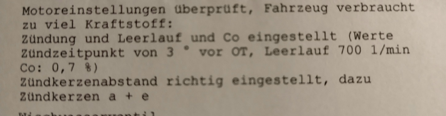 Die haben lt. Rechnung diverse Arbeiten gemacht, u.a. Zündkerzen neu einstellen, CO-Wert erhöhen (die andere Werkstatt hatte den gesenkt... ).